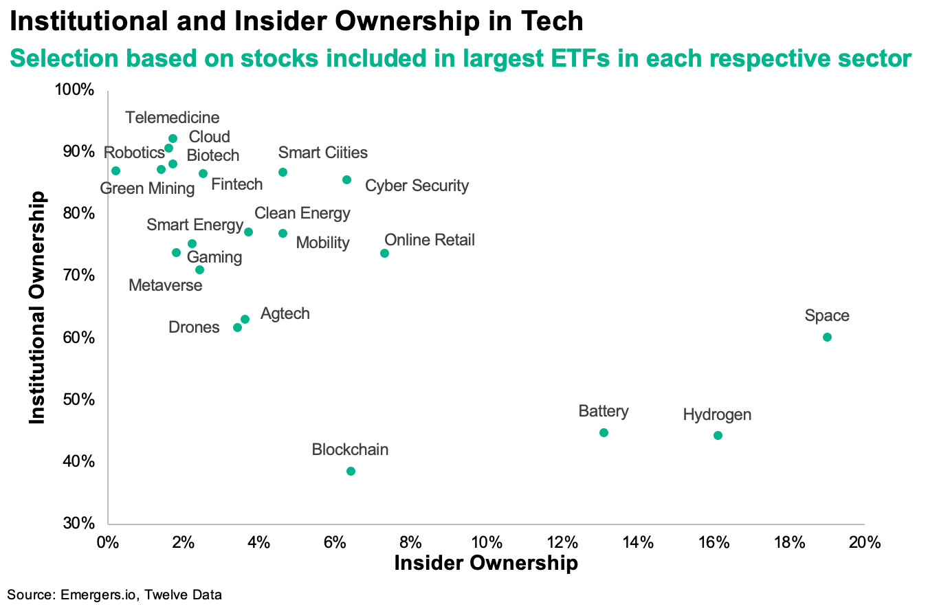 🔐 Cyber Security and Online Retail both enjoy relatively high shares of both institutional and insider ownership.