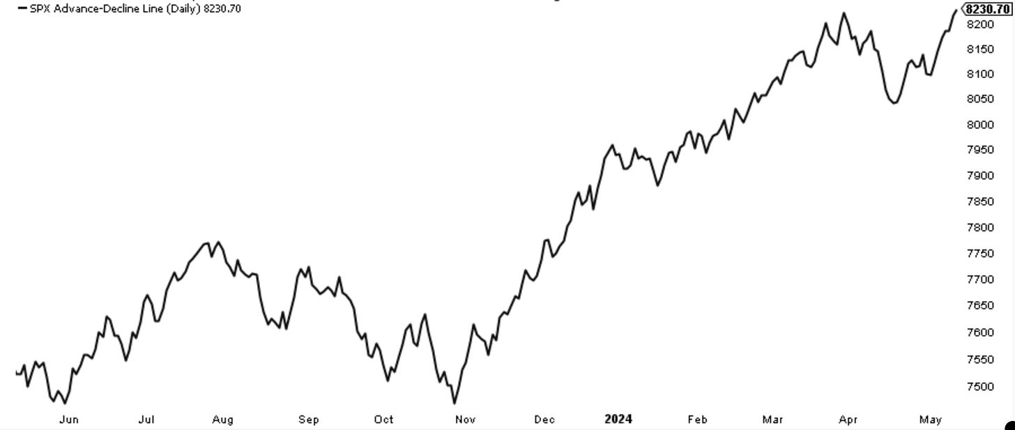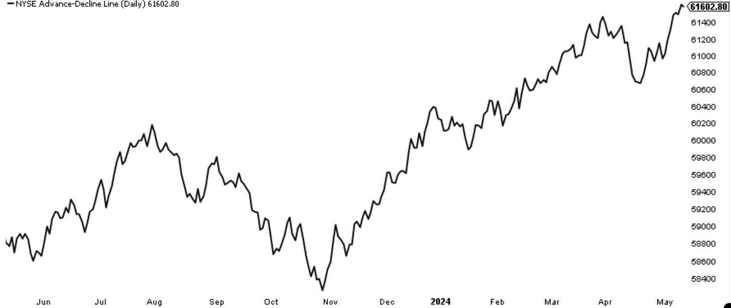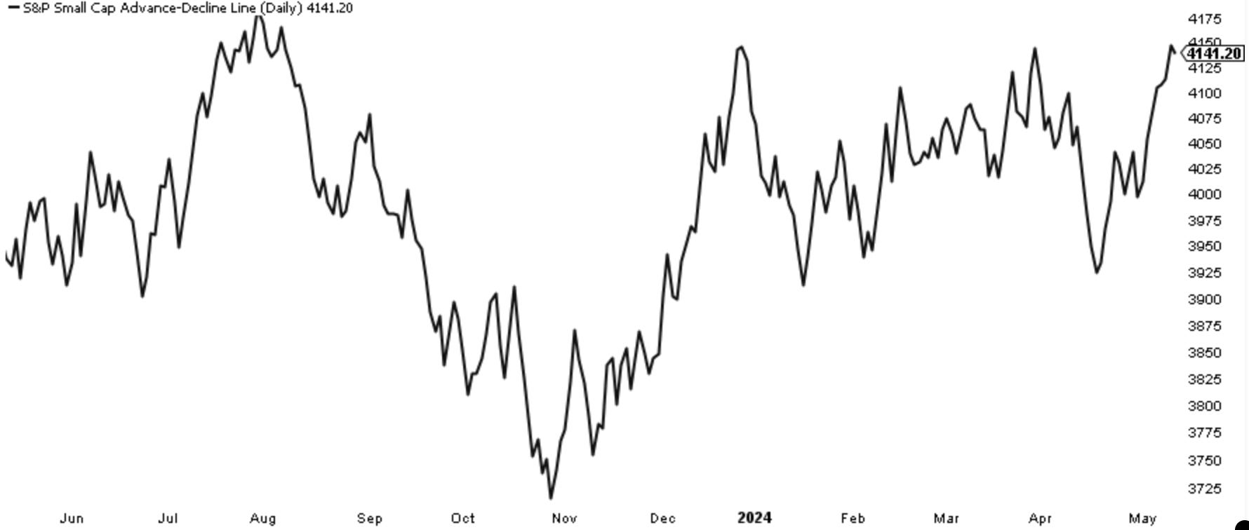 NYSE and SP500 Advance/Decline lines are at new highs, which is worth noticing as breadth leads price. Small cap is near a 52-week high.